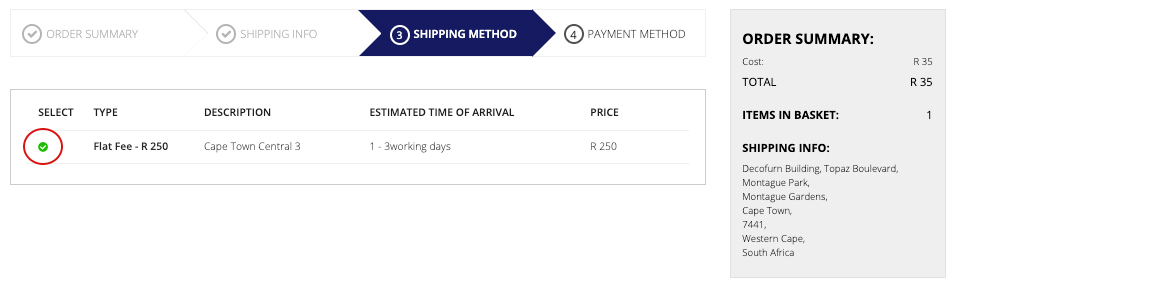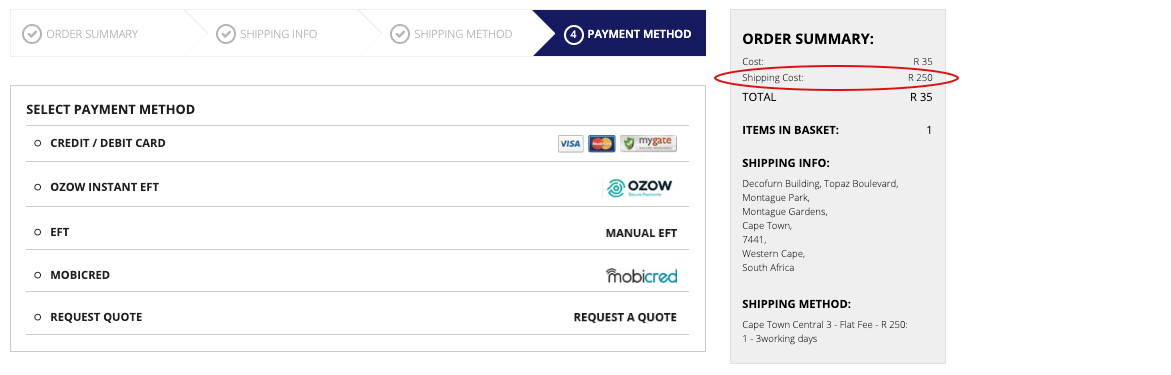You are now directed to the “Payment Method’ page where you will see the delivery fee has been added to your cart and will display in your Order Summary on the right hand side: